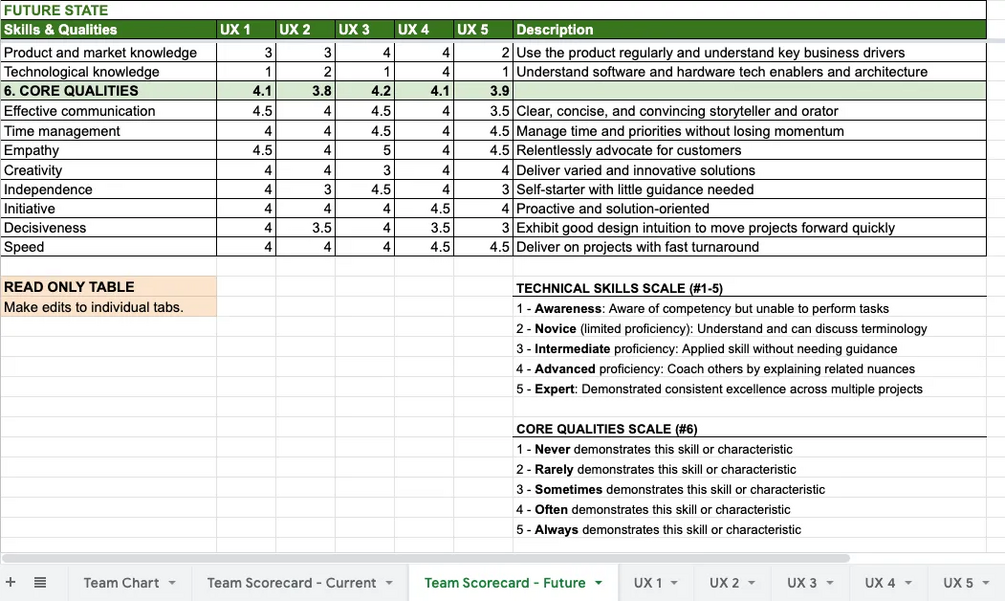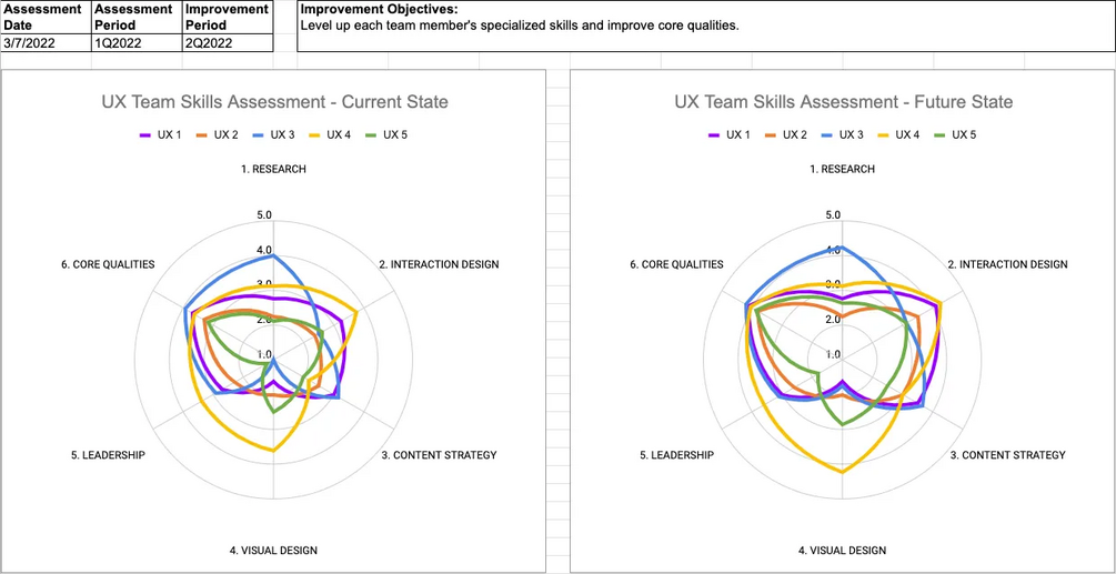 These UX Team Skill Mapping Scorecards can help you better identify focus areas, any gaps within your team, or training opportunities for individual contributors. Even if you’re not a manager, you can still use the individual scorecard to rate yourself and reflect on your professional goals with a clear focus.